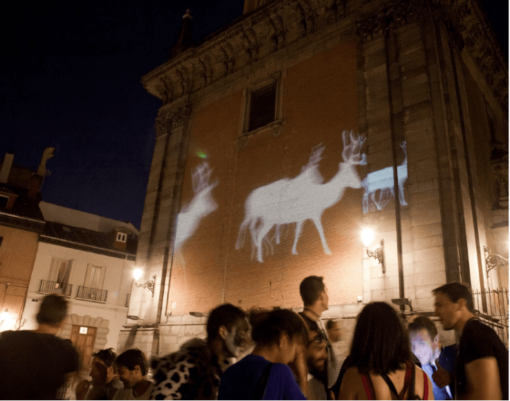 Besides geometric shapes, Riera often uses silhouettes of deer in his projections. In the artist’s words, “Frequently present in prehistoric paintings, throughout history the deer acquires a strong symbolism, relating it with the tree-shape, the mystic of the light, and concepts of cyclical renovation.” The deer stand as a testament to the resilience of the natural world but also as a symbol of humans’ desire to control nature, as deer are one of human’s most hunted animals, both for food and for sport.