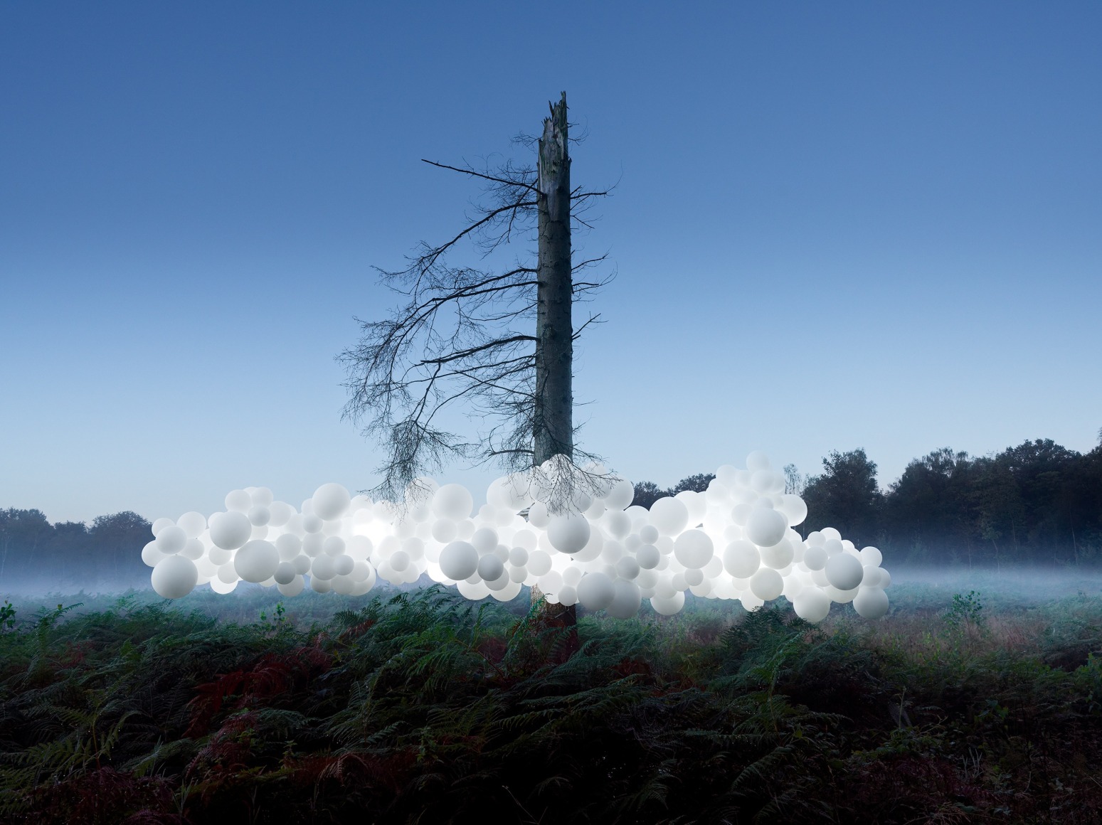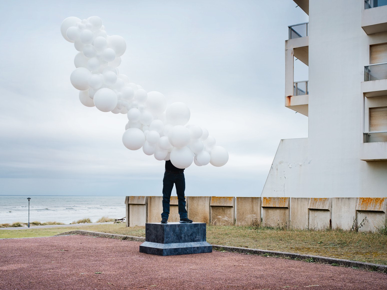 A self-taught man, researcher and photographer, Charles Pétillon (b. 1973) considers himself an image ethnologist and an archaeologist of forms. Each of his images are created in accordance with a very precise procedure and guided by an immersion into the natural environment, which is at the center of his practice. Using white balloons, Pétillon creates large-scale installations that are hauntingly beautiful. While the balloons call to mind a childlike humor and innocence, they are also somewhat threatening, hence the name of the series itself: Invasions. For Pétillon, “These balloon invasions are metaphors. Their goal is to change the way in which we see the things we live alongside each day without really noticing them. It is our way of looking at things that I am trying to transform and revive, and therefore make it possible to go beyond practical perception to aesthetic experience.”