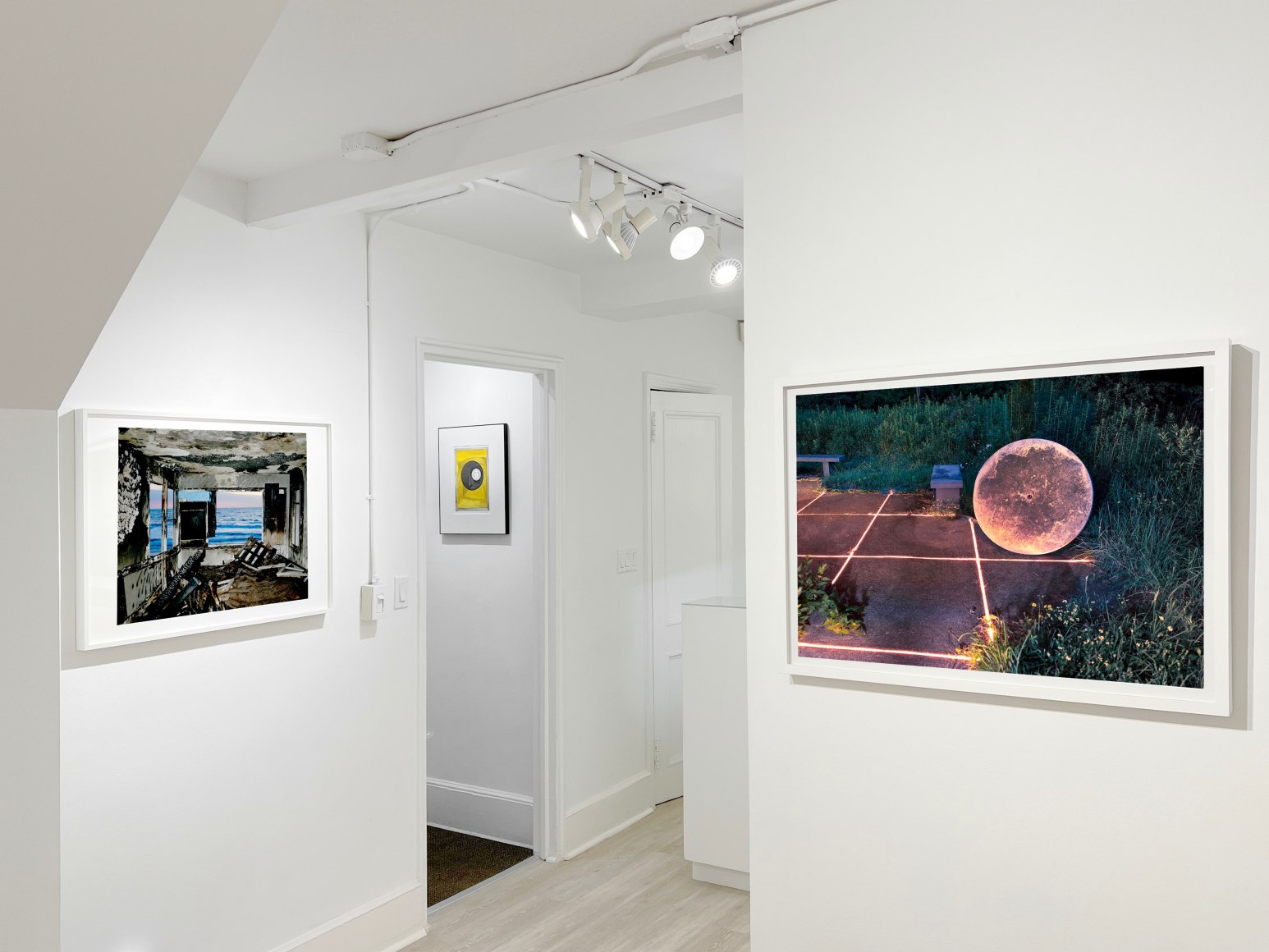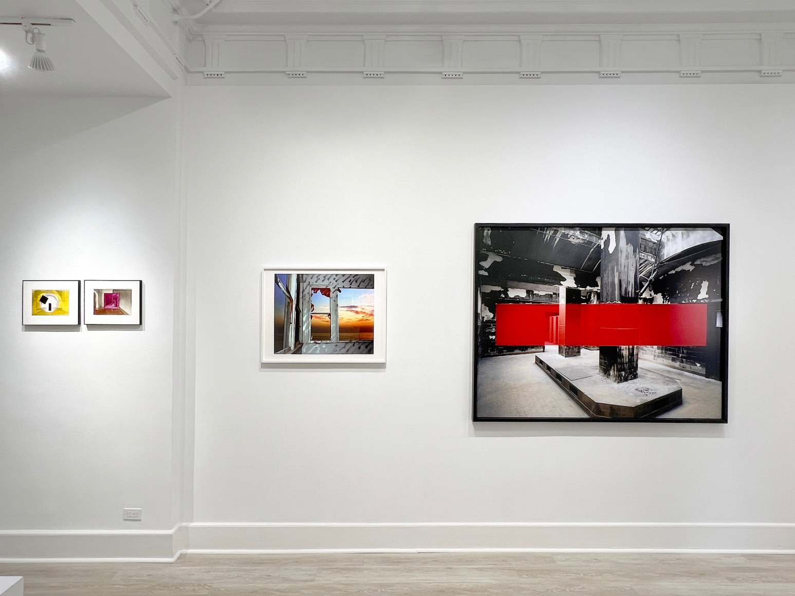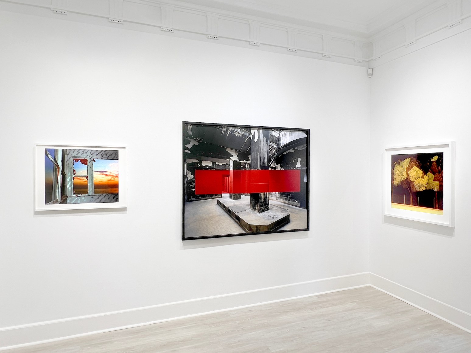 JOHN DIVOLA: As a young artist in the 1970s, Divola adopted vacant houses as a ready-made studio, both observing the changes to the physical spaces made by others and applying his own interventions. using spray paint, string, or thrown magazines. For his ground-breaking Zuma Series (1977-1978), Divola focused on an abandoned property on Zuma Beach in Southern California. The building was repeatedly burned and damaged in various ways by the fire department who used i t for training exercises and practice drills. Over the course of a year, Divola returned on numerous occasions to photograph the site, making additions to the interior with inscrutable marks of paint and graffiti, augmented by others’ vandalism, decay from natural elements, and the passage of time. In each image, he has used the rectangular openings of the house’s windows and doors to frame the idyllic seascape beyond, juxtaposing interior dereliction with the exterior serenity of the natural landscape and incorporating the colors of sea and sky as part of his overall palette. In Zuma #70 Divola activates the space further by throwing a colorful magazine into the scene. Divola describes Zuma Series (1977-1978), as “a product of [his] involvement with an evolving situation... My acts, my painting, my photographing, my considering, are part of, not separate from, this process of evolution and change.” His willingness to physically intervene with his surroundings, combined with his bold use of color, marked Divola’s departure from the status quo in an era that prized the neutrality of predominantly black and white documentary photography.